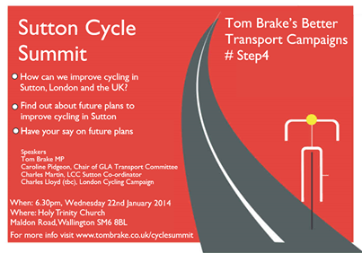 On Wednesday, 22 January 2014, Tom Brake MP, Carshalton and Wallington, is hosting a Cycle Summit to look at cycle safety, as part of his Better Transport Campaigns. The event is taking place at the Trinity Centre, Holy Trinity Church, Maldon Road (at the junction with Manor Road), Wallington, SM6 8BL, and starts at 6.30pm. Details on Tom’s Facebook page. Please join us if you can.