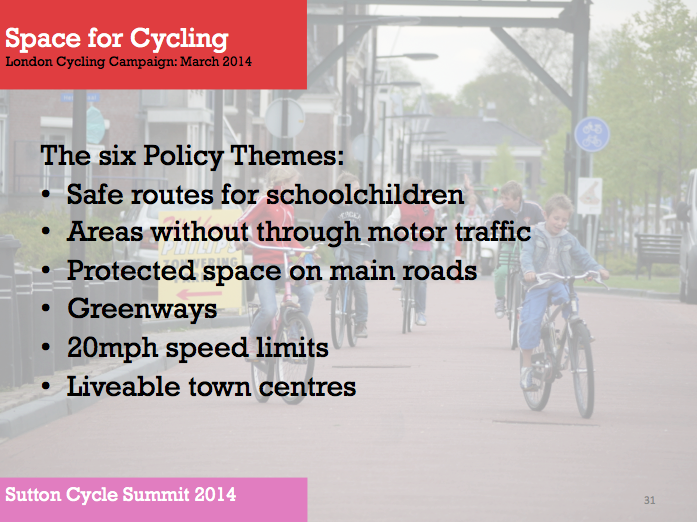 Space for Cycling is a London-wide initiative from the London Cycling Campaign, the purpose of which is to engage with all candidates who are standing in the council elections in May 2014, in all of London’s 600+ wards (including 18 in Sutton). Please stop by at our event anytime between 9.30am and 4pm, on Saturday 22 February, to view, discuss and talk through some ideas. Between us, we may just make 2014 the year in which cycling starts to get the full recognition it deserves in Sutton.