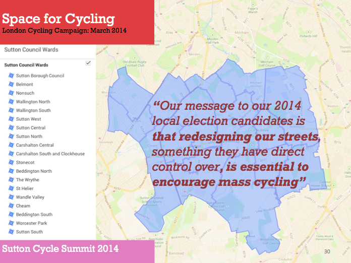 We will collate the responses to the survey to create our demands that will then be put forward to all the local candidates standing in the council elections in Sutton in May. Our aim is simply to ensure that, in time, our streets, roads and local communities, will become more people focussed, with walking and cycling seen as safe and normal activities.