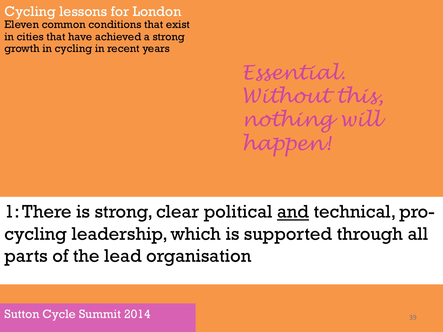 Unless cycling becomes more of a priority for Sutton Council, nothing much is going to change for cycling in Sutton. Findings from an international study last year found that the most important element or common condition, found in cities that had achieved high growth in cycling in recent years was strong, clear political leadership. It is anticipated that later this month, or early January 2015, the final report from that study (International Cycling Infrastructure Best Practice Study (Urban Movement, Phil Jones Associates) for Transport for London) will be published. You can get a sneak preview of this, including the other common conditions that exist in cities that have achieved strong growth in cycling, from Lessons from International Cycling Infrastructure – Best Practice Study.
