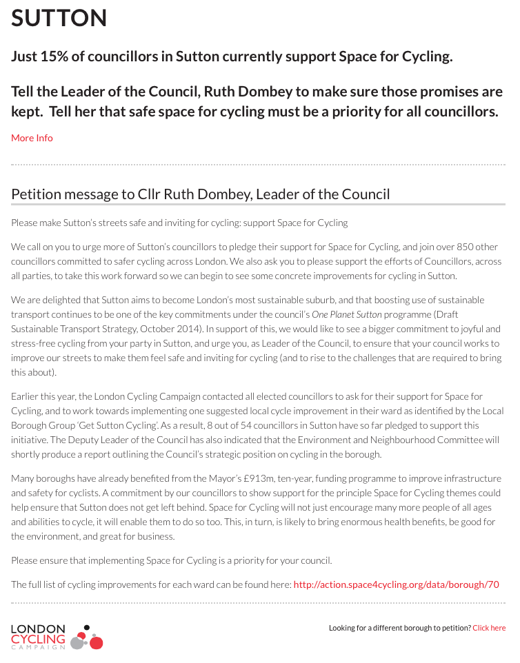 Please take a few moments to let the Leader of the Council, Councillor Ruth Dombey, know that you want to see action, and that high-quality space for cycling should be a priority for all councillors. All you need to do is visit the Sutton petition page and fill in your name, postcode and e-mail address; London Cycling Campaign’s computer system will do the rest for you. (If you live in another London borough, go to the London-wide petition page).