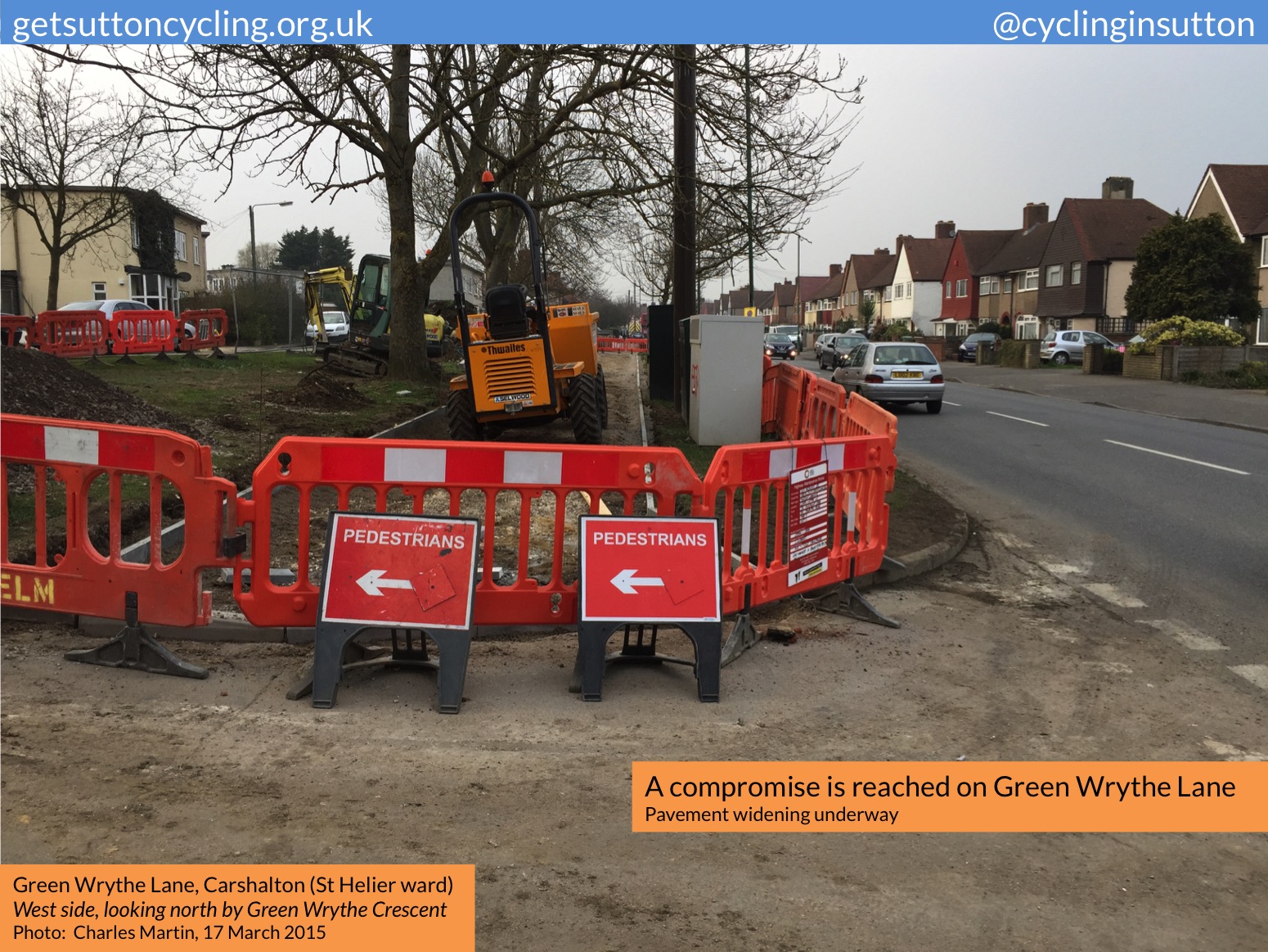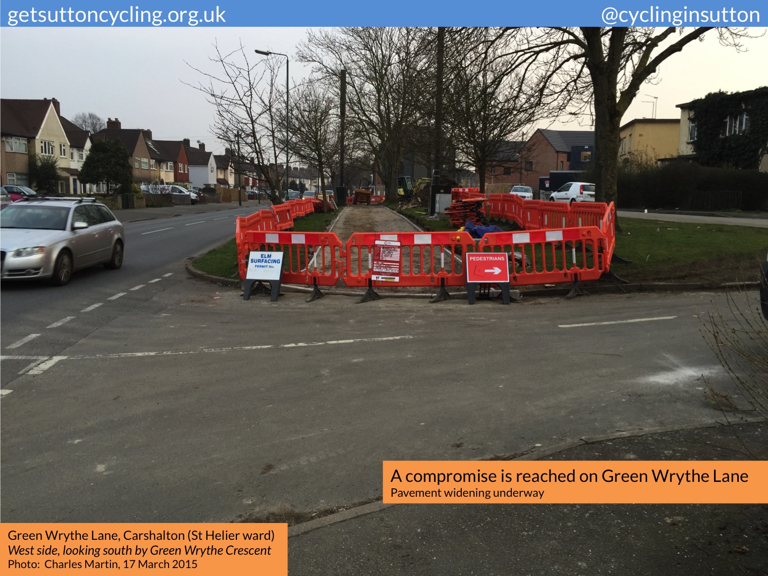 Further to our 22 January 2015 update on the Green Wrythe Lane footway cycleway we now understand, from the minutes of the Sutton Council meeting held on 19 January 2015 and from correspondence received from Transport for London in early March 2015, that a compromise position has been reached.