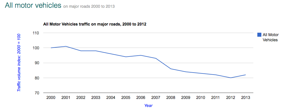 There is also evidence to suggest that traffic levels are declining. Figures released by the Department for Transport [1] show a near continuous downward trend in the total number of vehicles on major roads in Croydon between 2000 and 2012 (Figure 1).