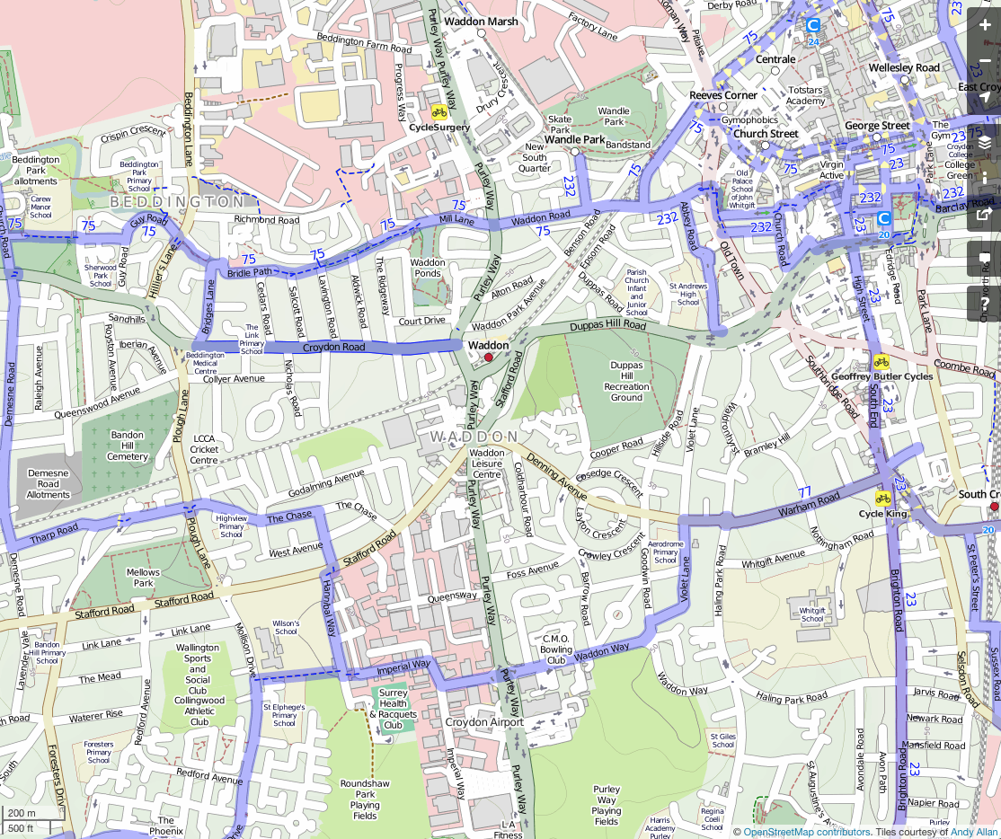 - The provision of fully segregated cycle paths along the full alignment of Purley Way (A23) extending north from at least the point where Imperial Way/Waddon Way (LCN 76/77) intersects with Purley Way in the south, to at least the point where Waddon Park Avenue intersects with Purley Way in the north, but preferably continuing on to Mill Lane/Waddon Road (LCN 75; future Quietway). It is recognised that this may require compulsory purchase of land on Purley Way (A23), especially to the north of Croydon Road (A232).
