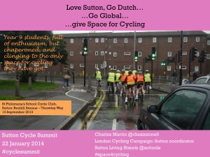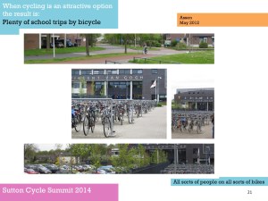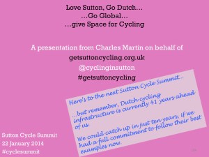 Love Sutton, Go Dutch….Go Global…give Space for Cycling, was a rather long title, to quite a lengthy presentation. The presentation was so extensive, in fact, that there was not quite sufficient time at the 2014 event to show all 104 slides (and I’m thankful to Tom for kindly letting me continue to about three quarters of the way through)!