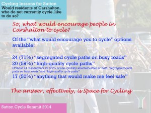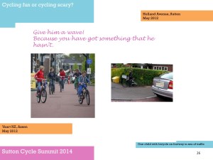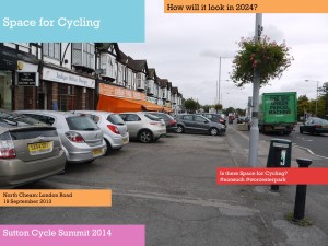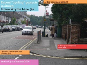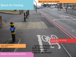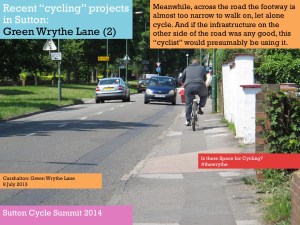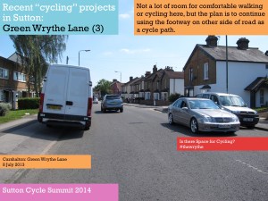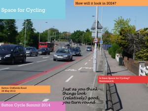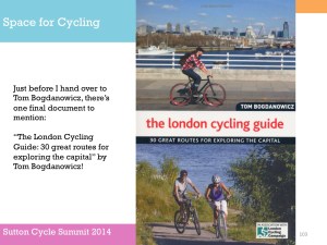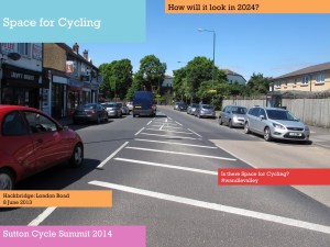 One of the purposes of the summit, Tom said, was to get people together to try and identify such issues as Park Lane and also consider what Sutton, London and national government could do to resolve them. [As far as I am aware, nothing was subsequently produced outlining the findings of those discussions. Of course, nearly a year earlier in March 2013, the Mayor of London had already published his Vision for Cycling, and this had been closely followed by the All-Party Parliamentary Cycling Group’s Get Britain Cycling. So, as a lot was know already really. Meanwhile, at the time of the summit, the London Cycling Campaign was preparing for Space for Cycling, and Get Sutton Cycling subsequently came up with lots of ideas ahead of the May 2014 council elections with Space for Cycling: action points for Sutton].