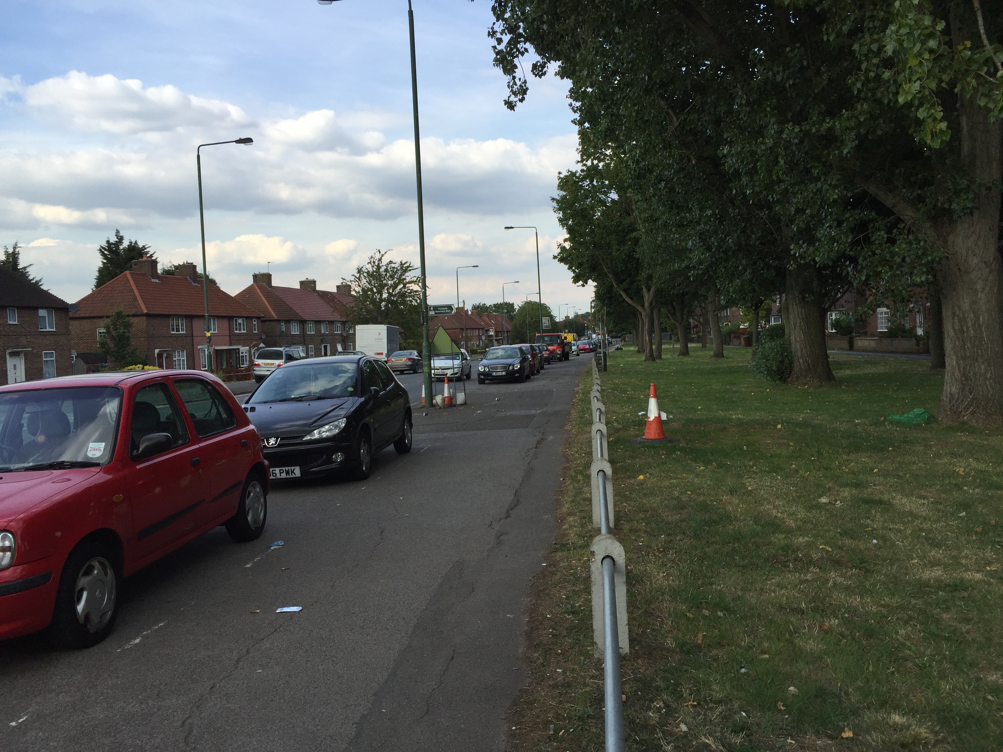 Bishops ford Road, east side, looking north. Is there Space for Cycling here? Photo 7 August 2015, Charles Martin