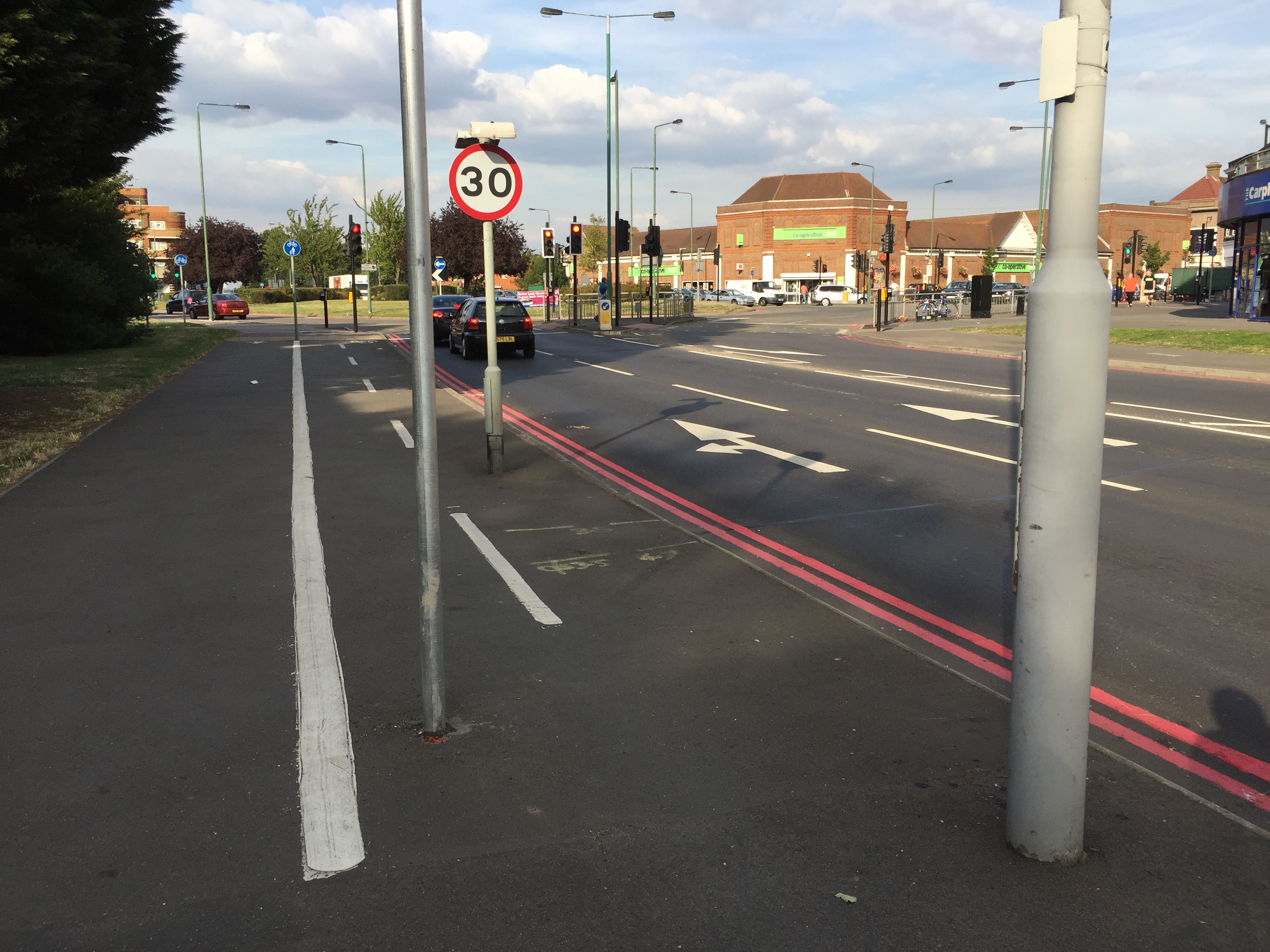 (8) Reigate Avenue [Google Maps Street View]: Vehicles parked on cycle path, posts and poles in cycle path. Poor path surface, not maintained, litter and gravel left on surface….. A217, miles of it to Cheam.