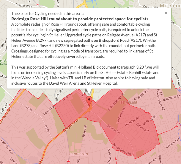 A screenshot of the Space for Cycling ‘ward ask’ for St Helier presented in 2014: Redesign Rose Hill roundabout to provide protected space for cyclists.