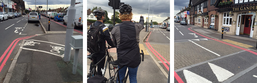 On Thursday the 8th of October, myself and John Courtman took Sutton Council’s Cycling Champion and Councillor, Manuel Abellan, on our third ride around the borough. This time we were looking at Cheam and the surrounding areas. We started in Cheam Village and agreed that it was a very car dominated High St.