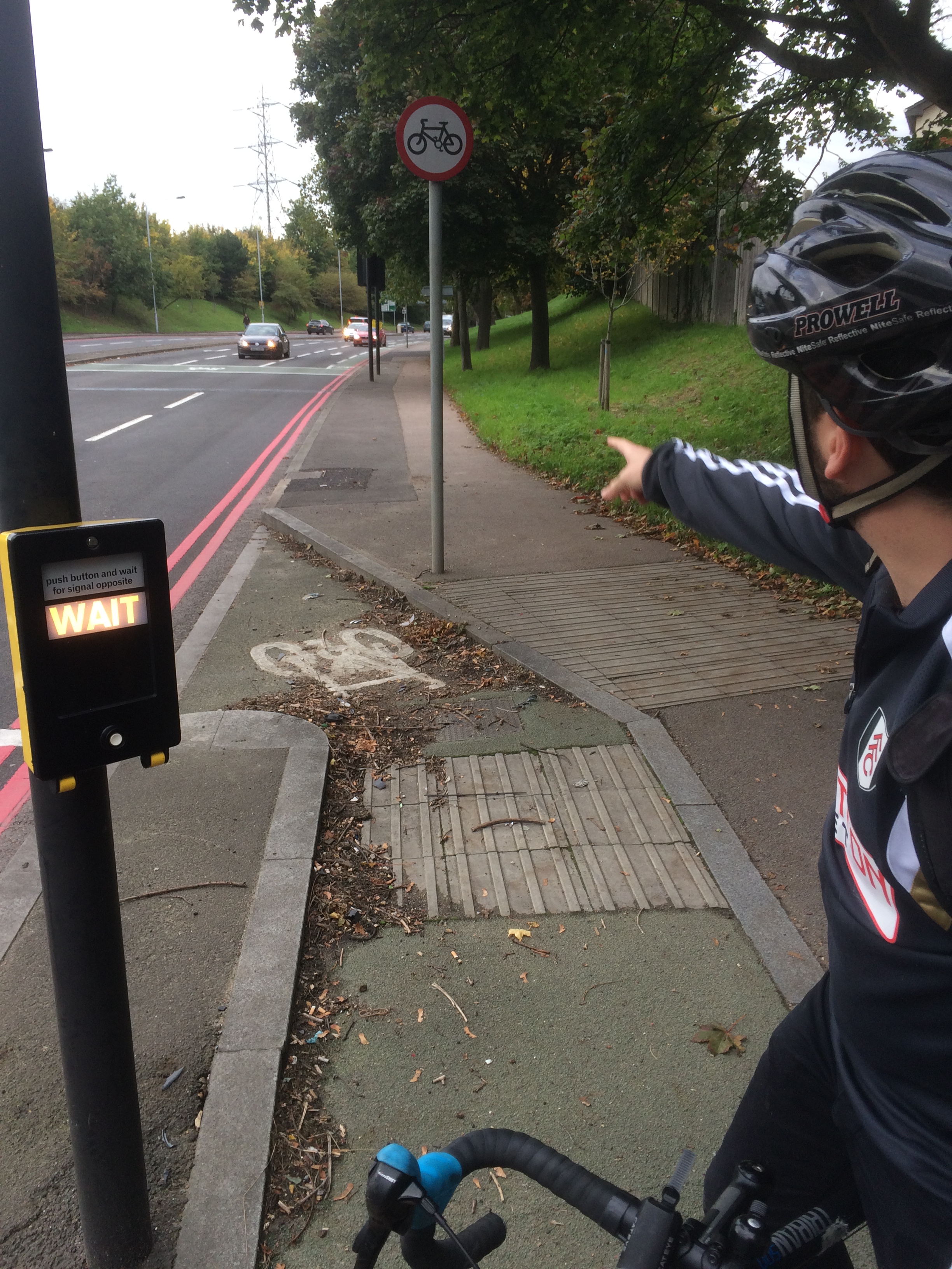There is already a cycle lane here but it is very poor and goes from the pavement, down on to the road and then back up on to the pavement again. Manuel suggested that it would be better if the path just stayed on the pavement and that the obstacles (lamp posts and cctv cameras) were moved somewhere else. There would be no need to keep it for pedestrian use as there is already a normal pavement outside the shops and pub. The junction on the other side of the road, coming from Sutton is also very poor. There is a section of pavement here that could easily be made shared use but is currently not (thought I think most people just already use it). If you are coming from the direction of Sutton down Collingwood Rd or Gander Green Rd and want to get on to the A217 cycle path to head to Rosehill it can be a bit tricky. You can go through the traffic lights, turn right on to the A217 and then try and get off it again and on to the path, in which case you might as well just stay on the A217; or you can get off your bike on the left at the traffic lights and then wait to cross the 2 sets of lights which is a bit convoluted; or you can get in the right hand lane as if you were turning right and then wait for a gap in the oncoming traffic, go on the wrong side of the road and then up on to the pavement, which I have seen a lot of people do. There needs to be better access to the cycle paths at these junctions and Manuel suggested that there might be room to make some improvements if some of the railings were removed.