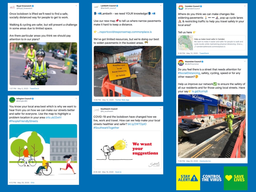 Throughout May, our post ‘London local authorities, Covid-19, and social distancing‘ continued to be updated almost daily with assessments of the official Twitter feeds of London’s 33 local authorities, as we looked for messages along the lines of “What can we do to help you maintain social distancing when you are making essential journeys or taking exercise?”. Gratifyingly the search finally paid off on 5 May when the first such message was published (well done Greenwich). Five more authorities followed. As the month progressed, it became more interesting to also note whether boroughs were publishing messaging around the London Streetspace plan.