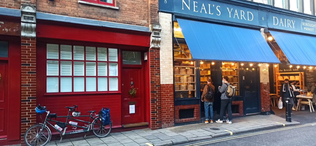 At this time of year we travel to a well known cheesemonger in London Bridge, but this time instead of getting on the Overground, we took the tandem. We departed in the early afternoon under the winter sun, we took a route which mainly used quiet ways. The ‘Q routes’, you may not know them well, although they are signposted and marked on the road, experience and memory (either au naturel or supplemented by technology) is needed to navigate them. It’s a pity these are not found in London’s southern and outer boroughs.