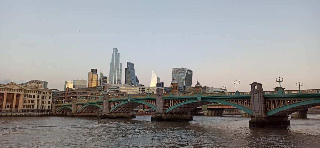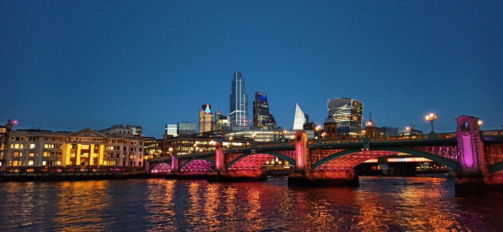 Over South Lambeth Road and Little Portugal takes us into a mix of Georgian terrace and 1930s social high rise. Without aid from the digital navigator, I managed to get to Harleyford road, and skirted around the Oval cricket ground. Leaving the sporting stadia took us along a widened cycle lane, it was a contra flow lane but now it’s both ways with armadillos protecting it. Following the arches of the South Western mainline, brought us out at Lambeth Palace. We could keep on the quiet ways but we opted for the other side of the Thames.
