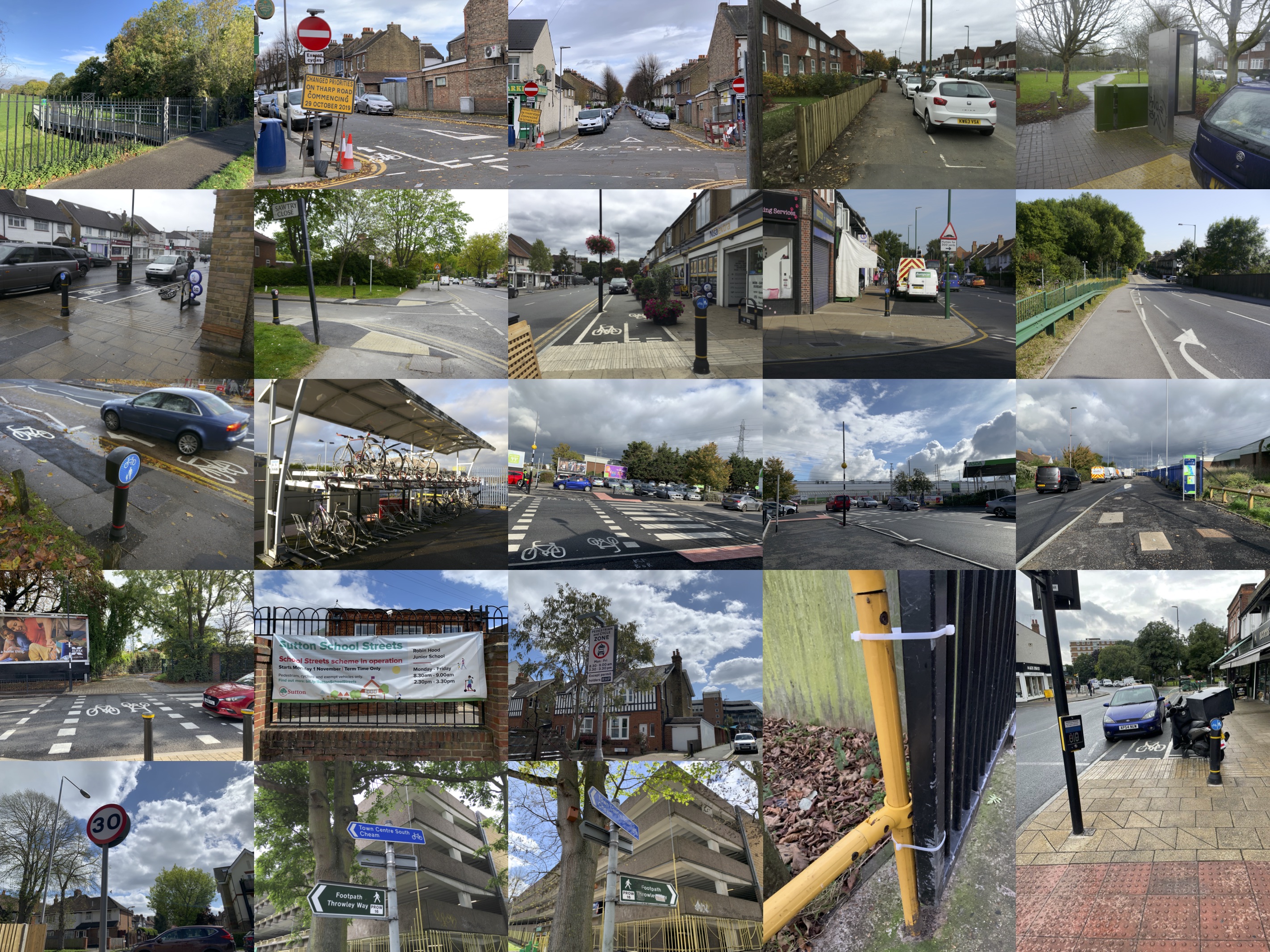 From top left: (1) Reigate Avenue / Reigate Avenue Recreation Ground, 27 October 2022; (2) Tharp Road / Demesne Road, 12 November 2019; (3) Tharp Road / Demesne Road, 12 November 2019; (4) Green Wrythe Lane, 24 October 2015; (5) Green Wrythe Lane / William Street / Wrythe Green, 29 January 2017; (6) Green Wrythe Lane, 29 January 2017; (7) Green Wrythe Lane / Sawtry Close, 24 April 2017; (8) Green Wrythe Lane, 15 August 2018; (9) Green Wrythe Lane, 13 September 2016; (10) London Road (Hackbridge), 23 July 2014; (11) Hackbridge Road, 21 November 2016; (12) Hackbridge Station, 21 November 2016; (13) Marlowe Way (Beddington Lane), 13 October 2022; (14) Marlowe Way (Beddington Lane), 13 October 2022; (15) Beddington Lane, 13 October 2022; (16) Beddington Lane (Derry Road), 13 October 2022; (17) Thorncroft Road (Robin Hood Junior School), 25 April 2023; (18) Thorncroft Road / Greenford Road, 25 April 2023; (19) Overton Park (Moore Way), 23 November 2021; (20) Green Wrythe Lane, 24 August 2021; (21) Western Road / Cheam Road, 25 April 2023; (22) Lenham Road / Manor Lane, 14 June 2016; (23) Lenham Road / Manor Lane, 25 April 2023
