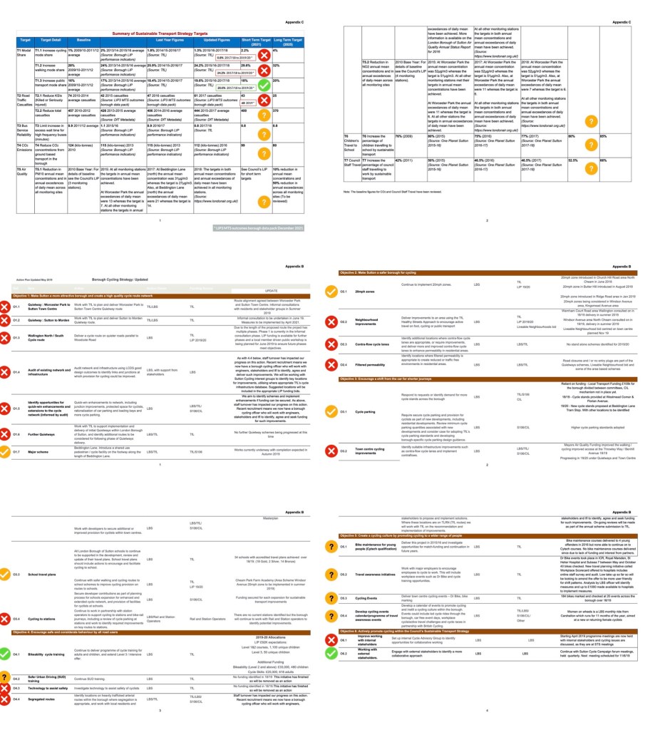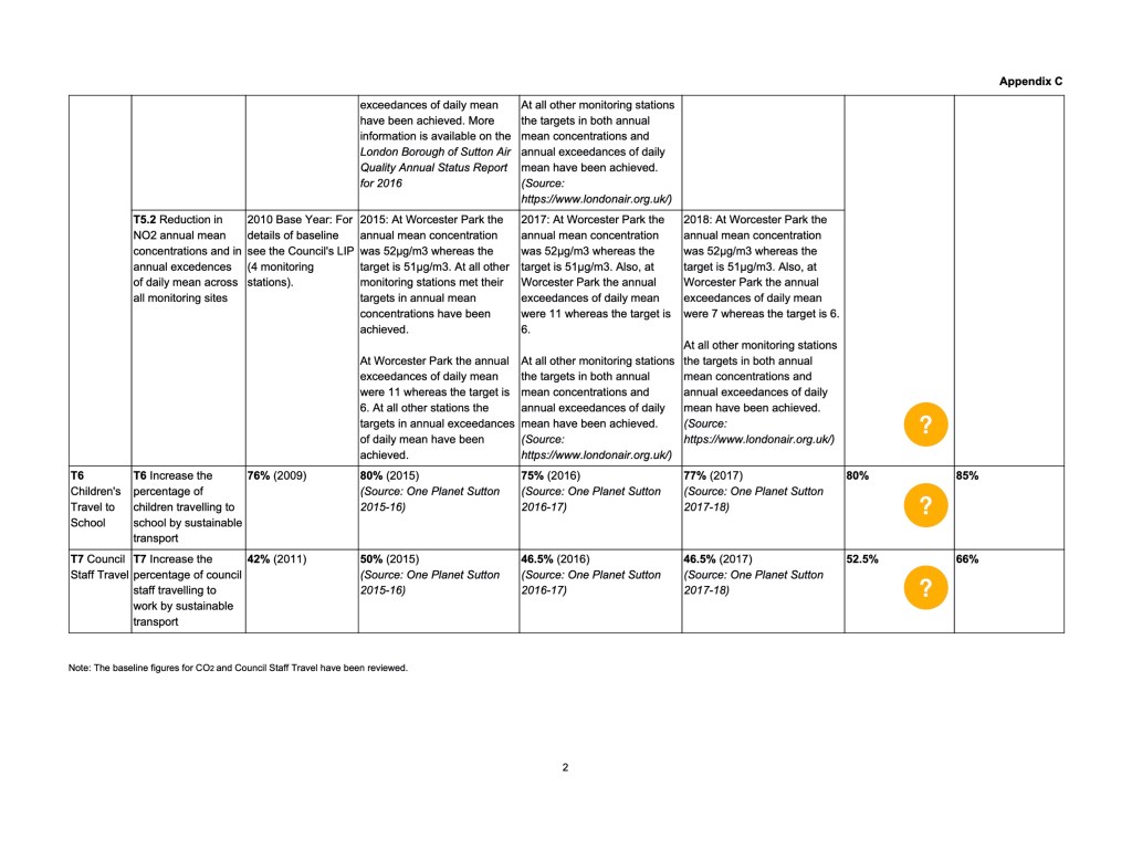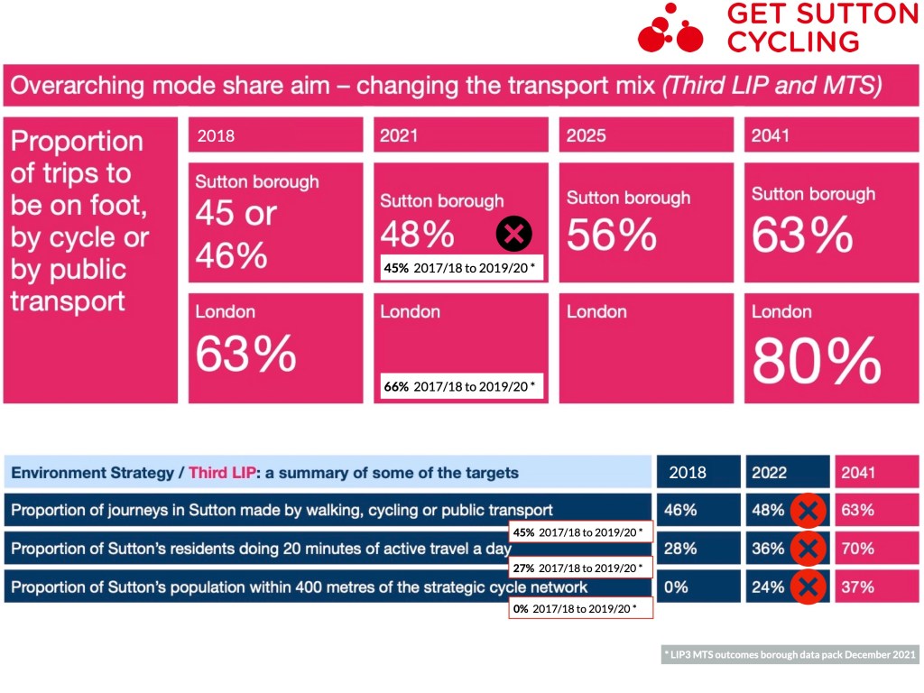 - Some targets set out in the Sutton’s now retired Sustainable Transport Strategy 2015-2021 were subsequently changed, and then not met, with no explanation or acknowledgement of the failings.