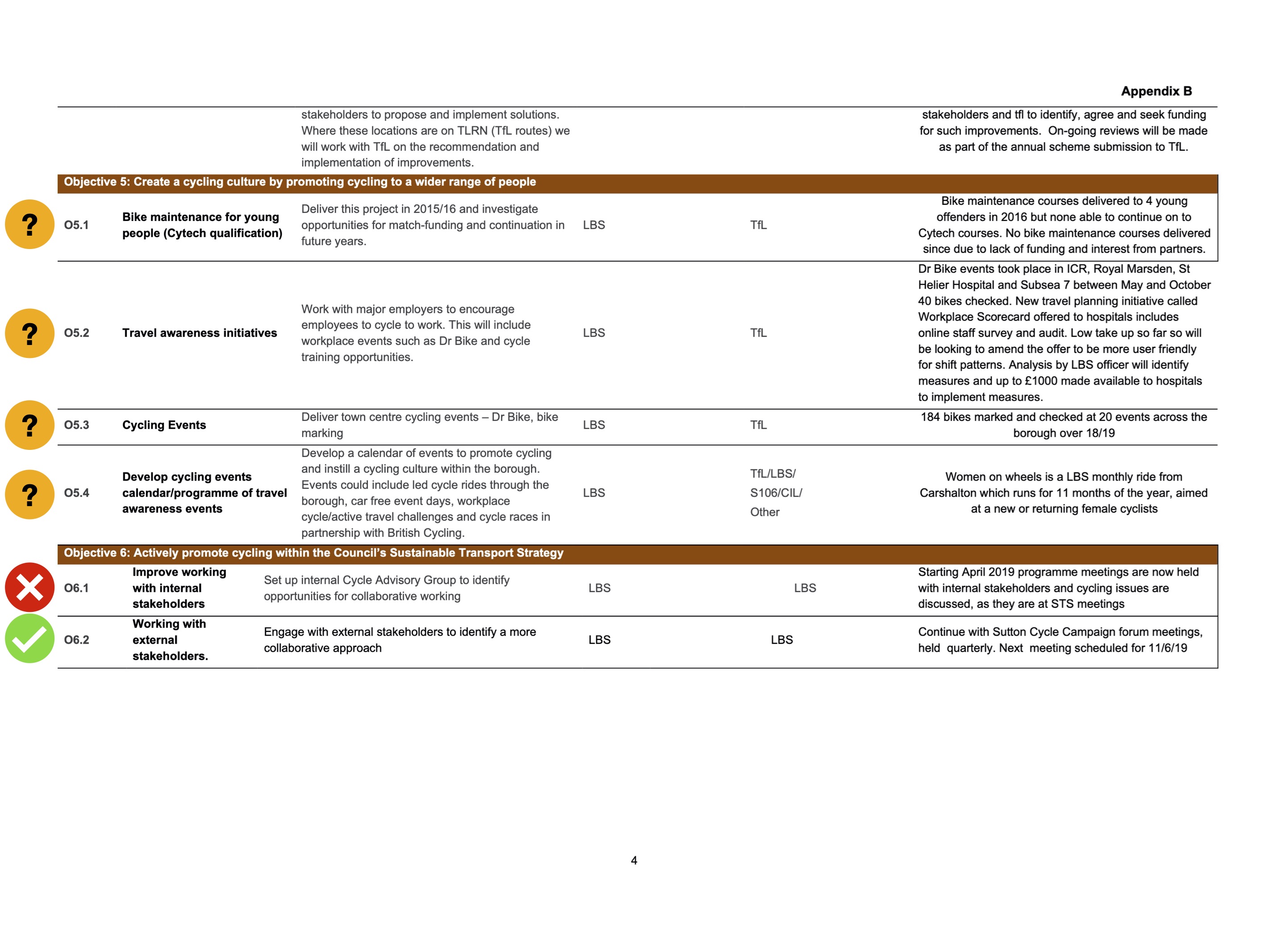The Cycling Strategy’s Action Plan (Table 4.1) detailed a total of thirty-three specific items listed across six objectives [10]. The ‘Monitoring and Review’ section (section 4.5) stated that the strategy was to be “monitored on a regular basis, with the support of internal and external stakeholders”, and would “be considered a ‘live’ document …. subject to regular review.“.