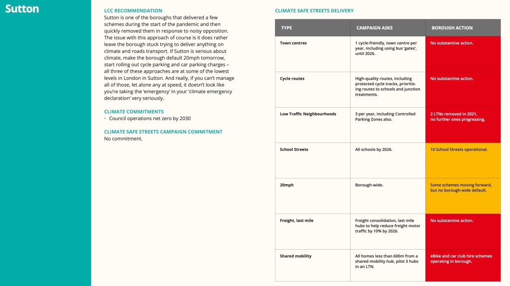 Cycling is obviously only part of a bigger picture – but we think there’s much we could do to work better together, particularly given the climate crisis. Lack of any substantive progress in Sutton is disappointing. Although other boroughs have similarly not succeeded on delivery, it is hoped that Sutton will not join the shrinking number of local authorities in London who may feel (for the time being at least) that there is safety in numbers. In other words, it would be hoped that Sutton would choose to be different, be far more ambitious, and not take comfort in wrapping itself in the warm blanket of Barnet, Bexley, Bromley, Harrow, Hillingdon, Redbridge – all of whom appear to be failing to take the lead in outer London. Future residents could, and probably will, point fingers. Let’s hope that future residents will look back in thanks for the decisions that were made today, and not look back and think “if only”.